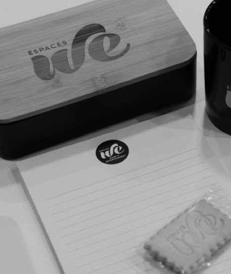 Chez We, nous avons pensé à vous dans les moindres détails dès votre arrivée. Un kit design de bienvenue sous forme de bento avec marqueur, crayons, blocs, petit biscuit sans oublier le mug pour le boss !
